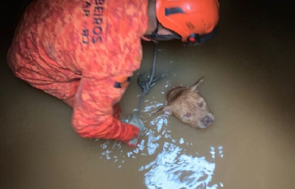 Bombeiros resgatam cão da raça American Bully após queda em bueiro no Recreio
